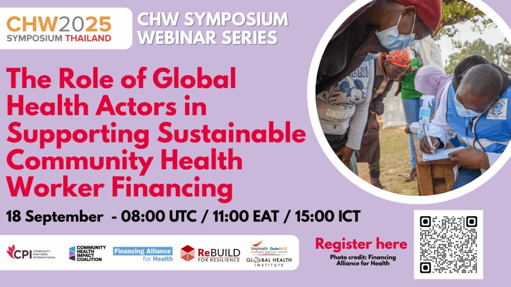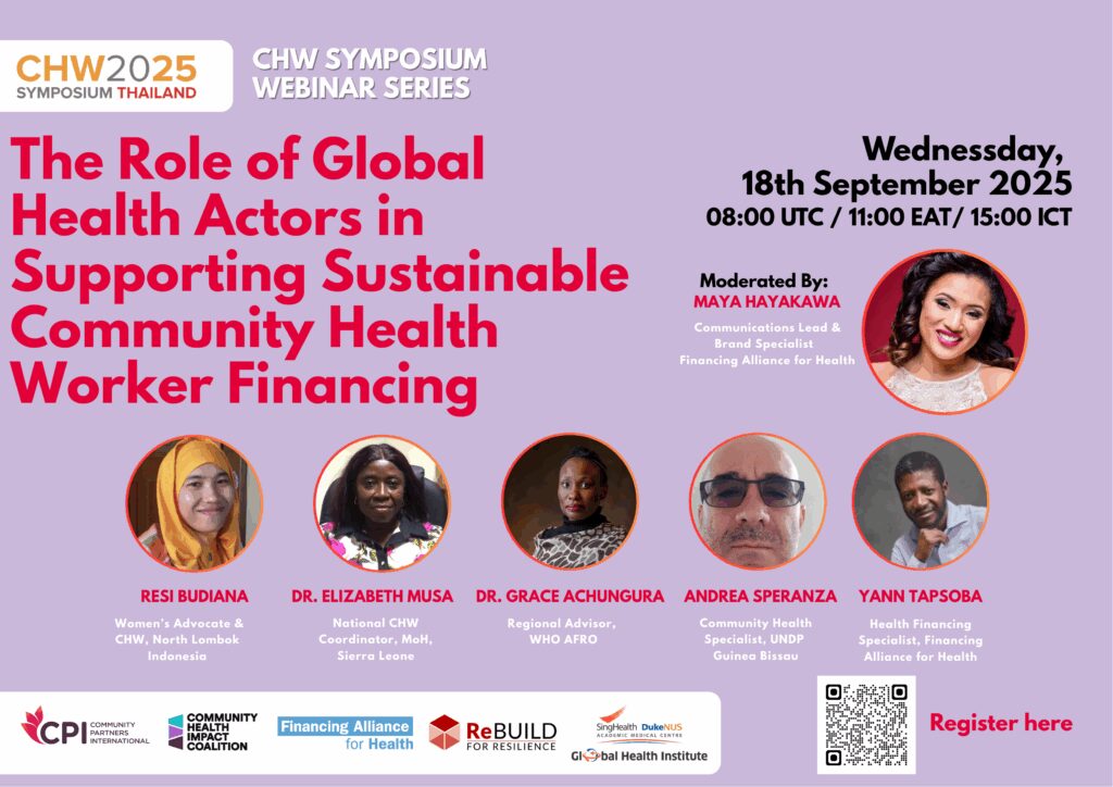 This webinar is especially co-organized by Financing Alliance for Health. This is part of a global series hosted by Community Partners International, in collaboration with ReBUILD for Resilience, SingHealth Duke-NUS Global Health Institute, and Community Health Impact Coalition, in the lead-up to the 4th International Community Health Workers Symposium, which will take place virtually on 10-14 November 2025. Please visit their websites to learn more about their works and contributions on CHWs and Global Health.